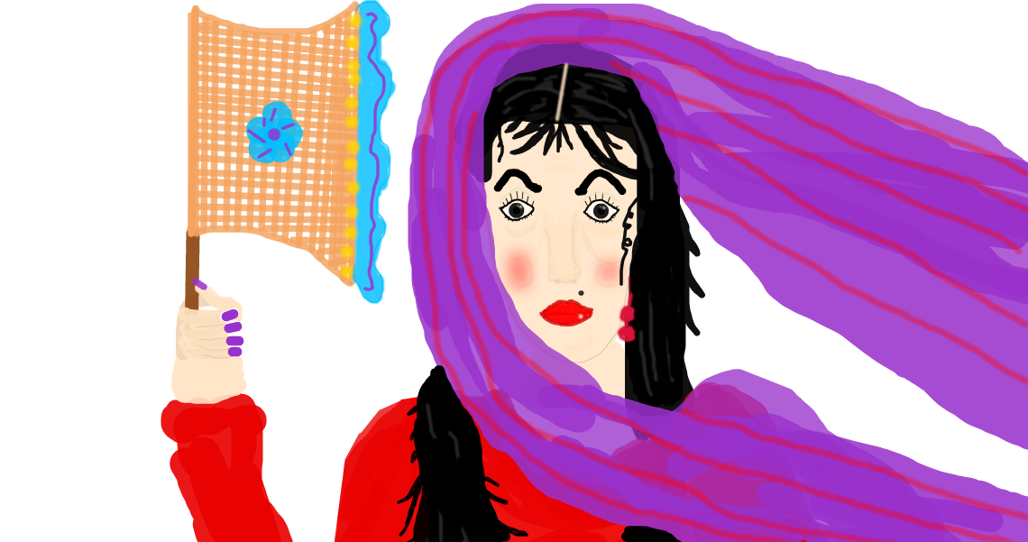 having hand made fan in her hand & wearing a dupatta of purple color...............