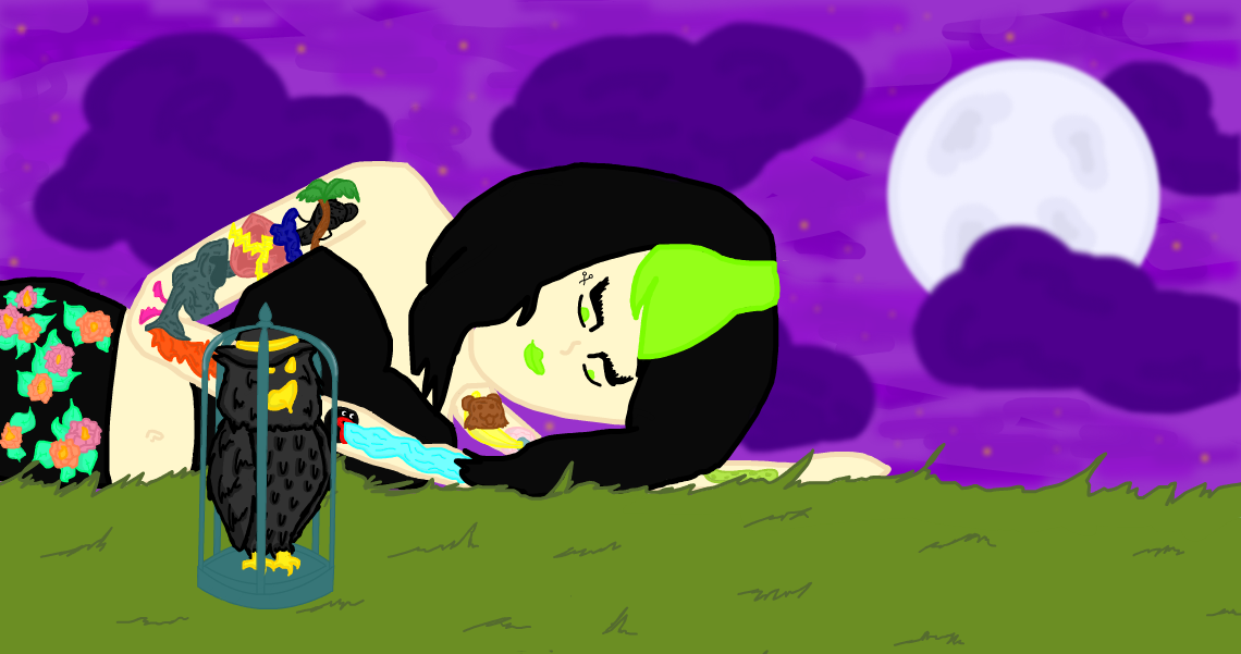A tattoo'd human has caged a mysterious bird in a magical cage. I wonder what she plans on doing...